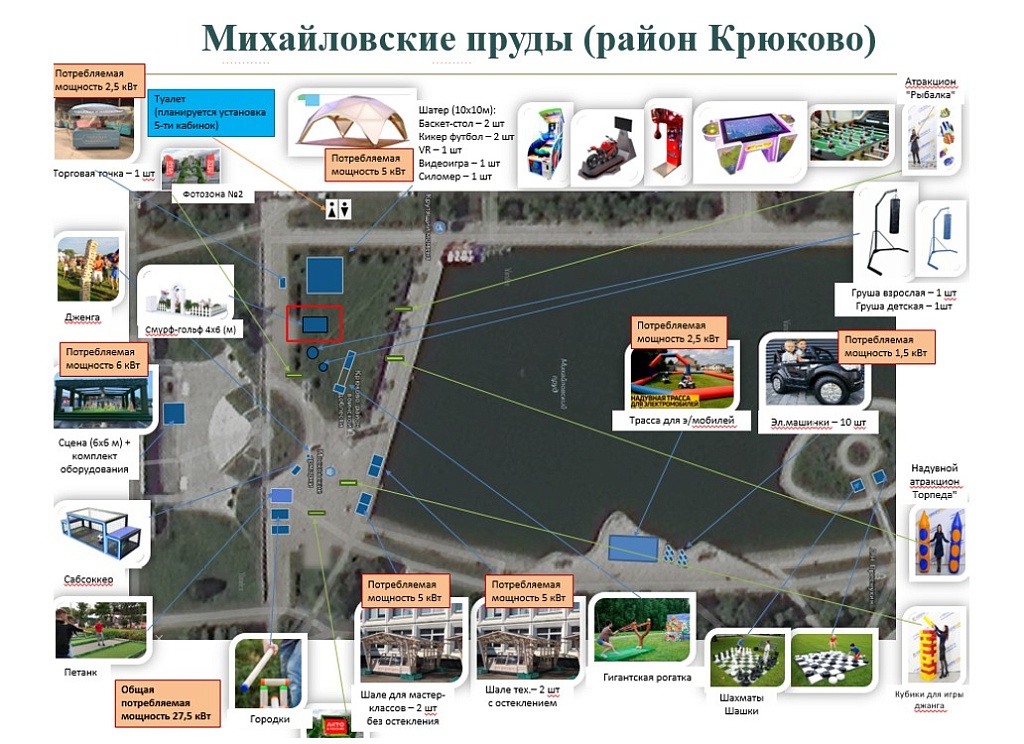 Зона отдыха Михайловские пруды. В 15 микрорайоне будут работать сцена, трасса для электромобилей с прокатом, шатер с игровыми автоматами, зона с гигантскими шахматами, шашками и рогаткой. Здесь можно будет также поиграть в сабсоккер (мини-площадка для ударов по мячу, огороженная сеткой), дженгу, городки и петанк.