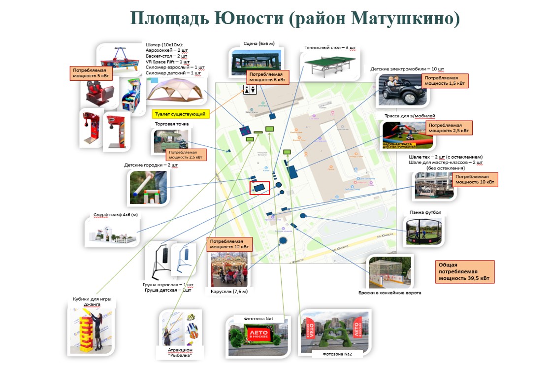 Площадь Юности. На площади Юности установят карусель и сцену, столы для настольного тенниса, трассу для электромобилей с прокатом, 2 шале для проведения мастер-классов, боксерские груши, зоны для игры в панна-футбол (круглый манеж, огороженный сеткой), хоккей (броски в ворота), мини-гольф, городки. Также будут шатры с игровыми автоматами и VR-очками.