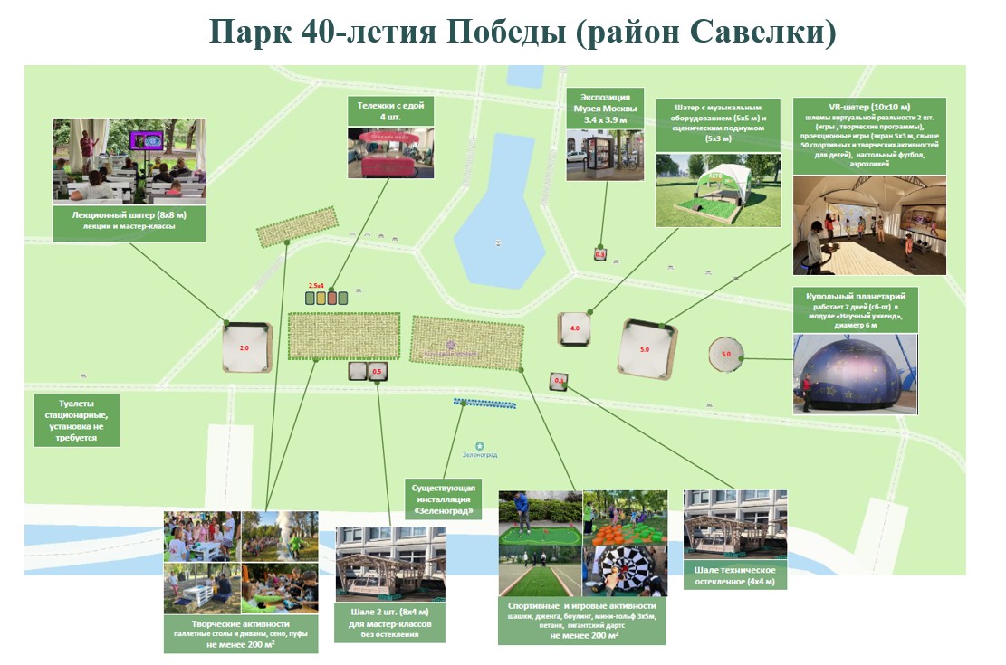 Парк 40-летия Победы. Не менее насыщенное наполнение будет и на нижней площадке каскада фонтанов в Парке 40-летия Победы. Здесь разместятся сразу несколько шатров (лекционный, музыкальный, виртуальной реальности, с игровыми автоматами), мобильный купольный планетарий, экспозиция Музея Москвы, спортивная зона (шашки, дженга, боулинг, мини-гольф, петанк, гигантский дартс), 2 шале для мастер-классов, зона творческих активностей.