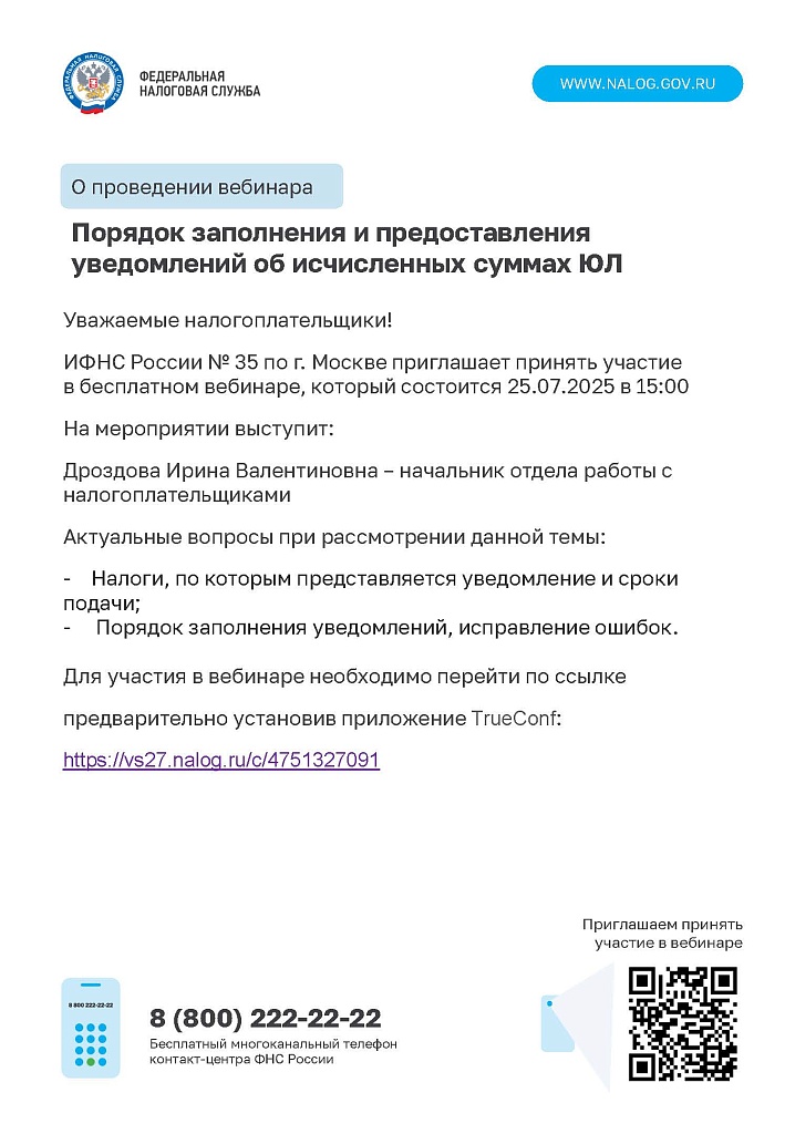 ИФНС России № 35 по г. Москве приглашает принять участие в бесплатном вебинаре, который состоится 25.07.2025 в 15:00