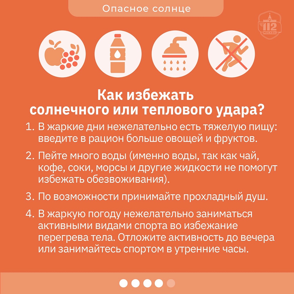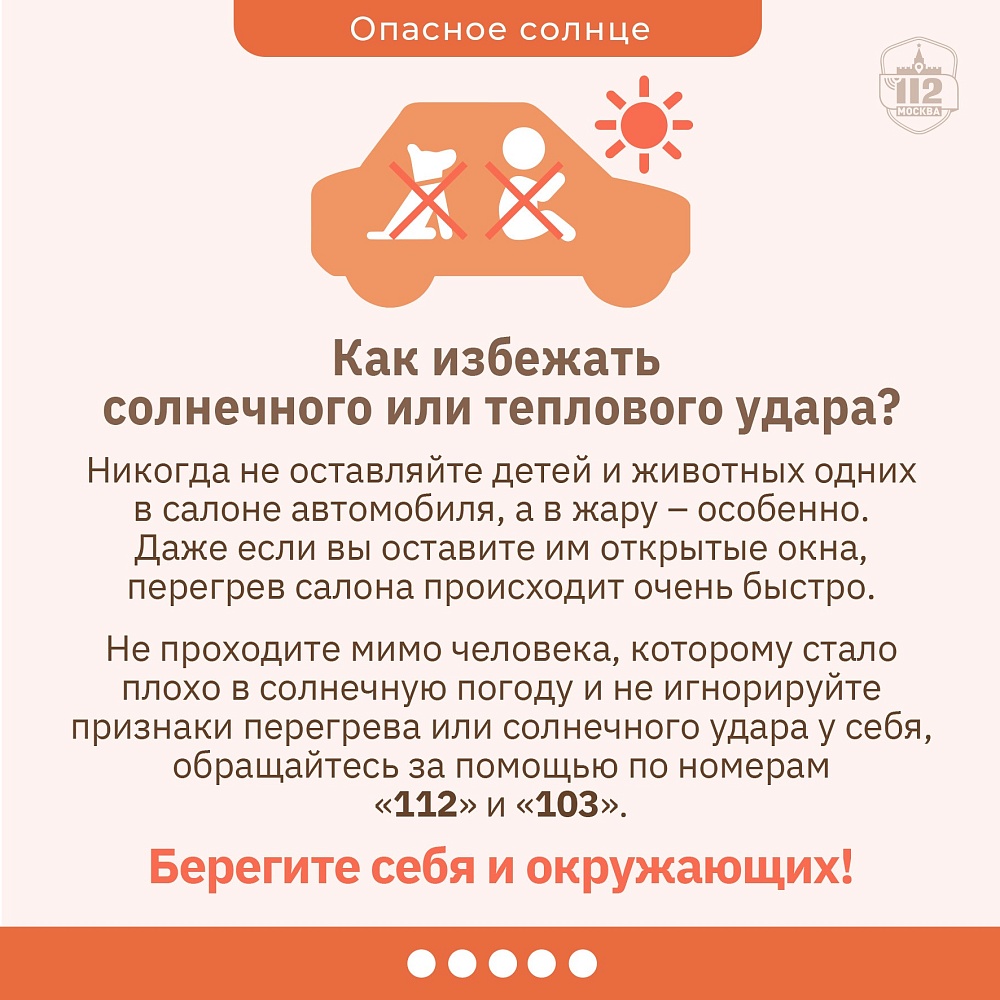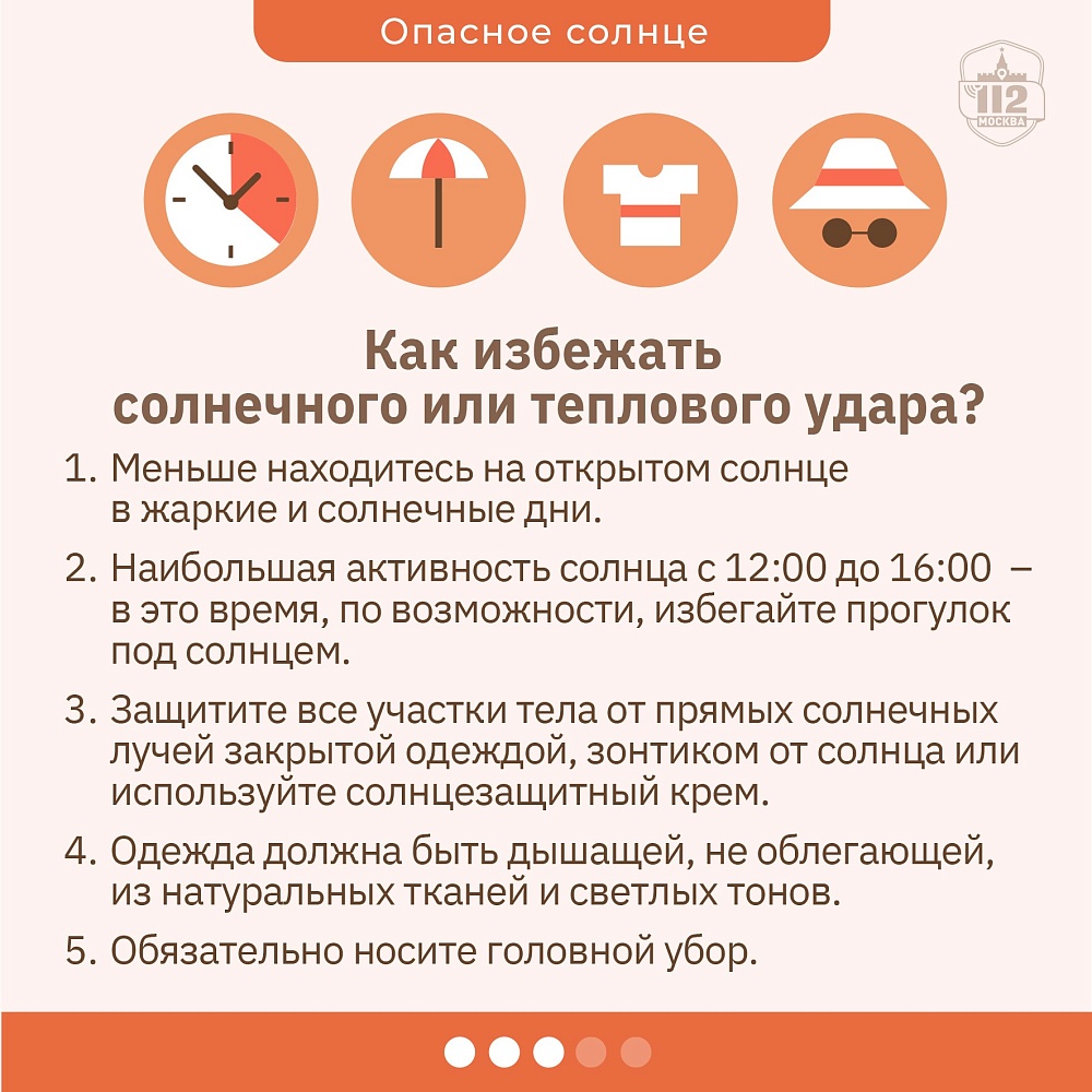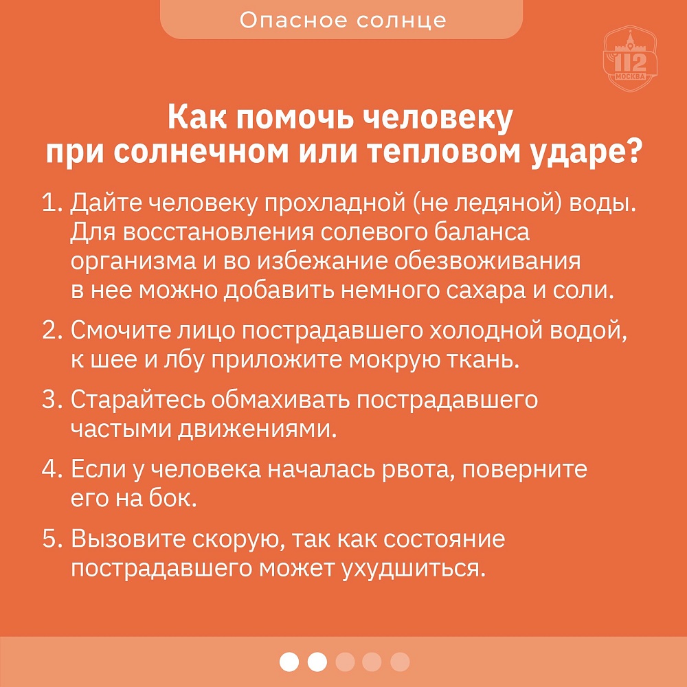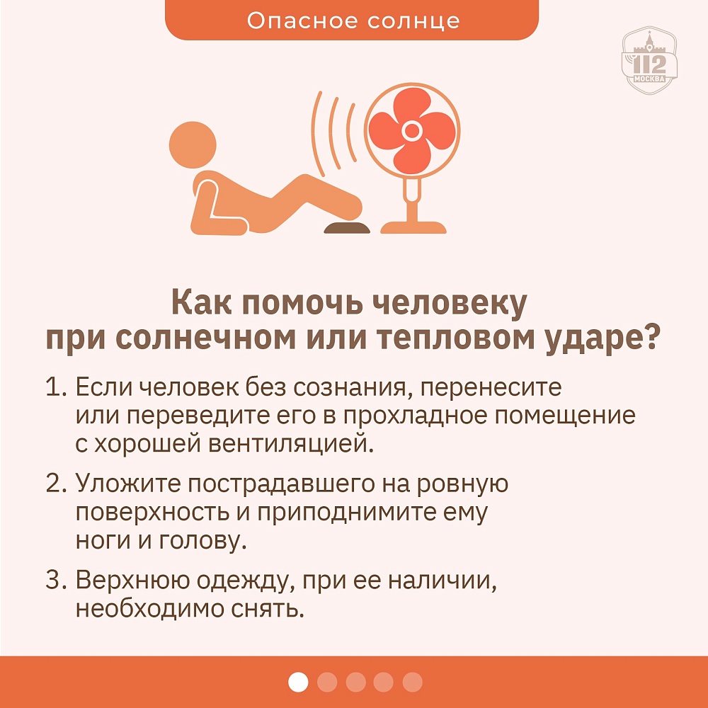 Летом чаще чем в другие времена года, нас радует солнце, но всегда надо помнить, что оно является не только источником тепла и света, но и представляет опасность для здоровья. Вышли из дома без головного убора, долго пробыли на солнце или в душном помещении – может, например, случиться солнечный или тепловой удар. В Службу 112 Москвы в летние дни нередко поступают различные вызовы с просьбами прислать скорую.