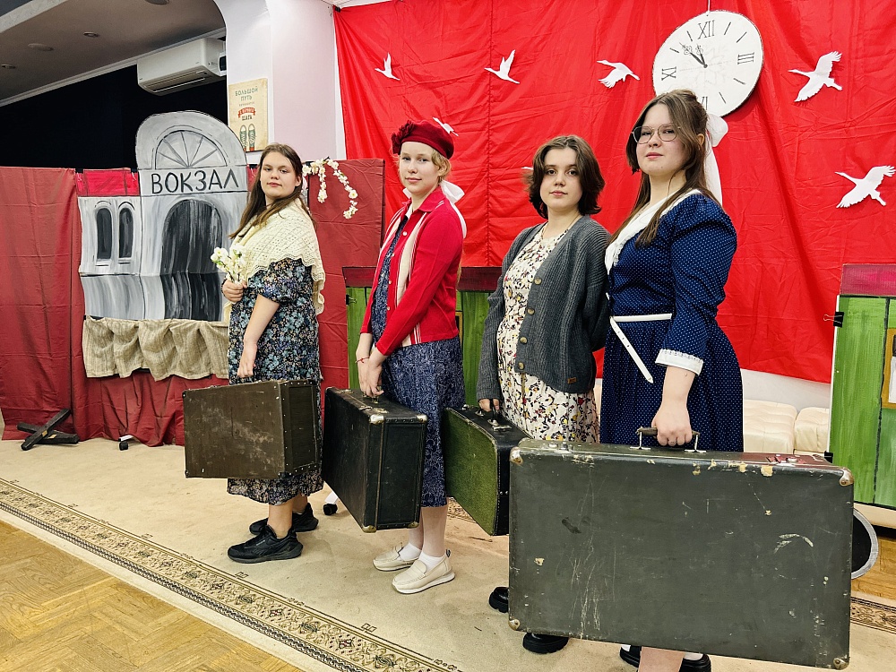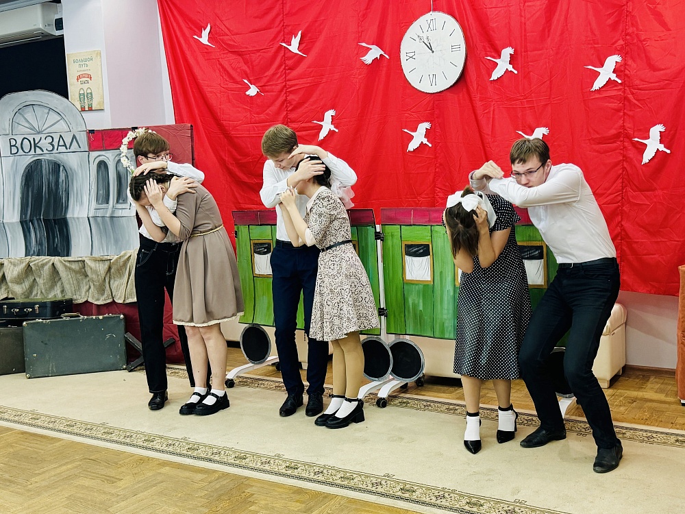Перед премьерой спектакля гостей встречали подростки волонтёры, которые организовали акцию «Георгиевская лента» и провожали зрителей в зал. Спектакль «Дорогами Победы» — это история, рассказанная участниками театральной студии «Импровизация», основанная на переплетениях реальных человеческих судеб, прошедших войну и подвиге людей, которые ценой собственной жизни боролись за мирное небо.